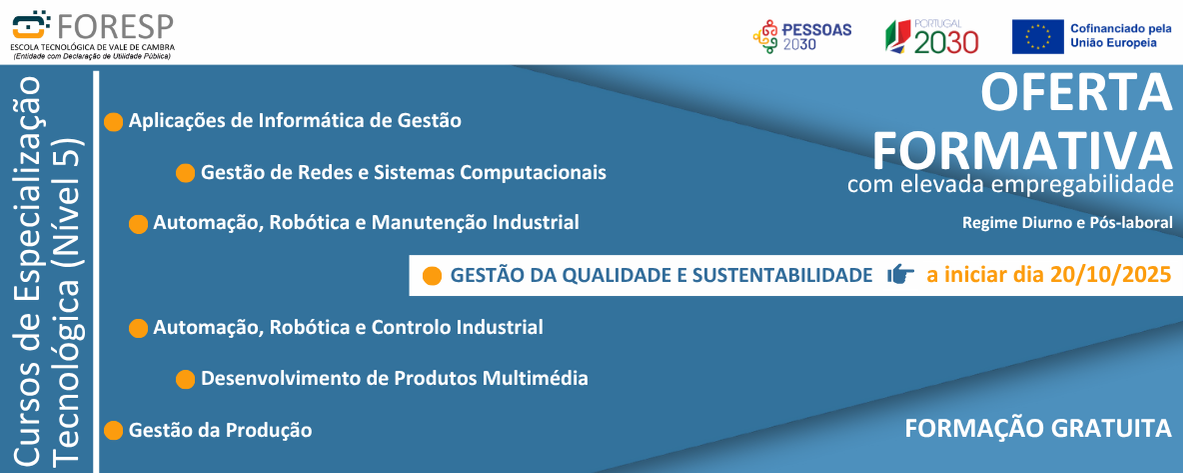 A Foresp– Escola Tecnológica de Vale de Cambra informa que, foi aprovada a sua candidatura n.º PESSOAS-FSE+-01848600, submetida ao “PESSOAS 2030”, relativa ao pedido de...Ler Mais